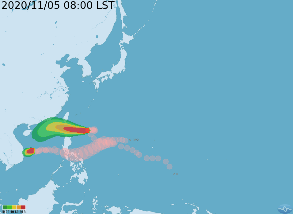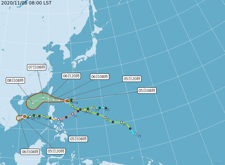 中心位置:5日14時的中心位置在北緯 20.2 度,東經 125.3 度,即在鵝鑾鼻的東南東方約 490 公里之處