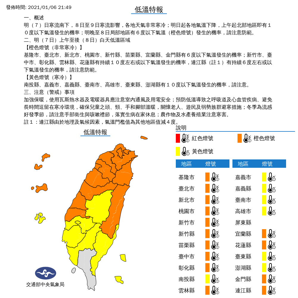 基隆市、臺北市、新北市、桃園市、新竹縣、苗栗縣、宜蘭縣、金門縣有6度以下氣溫發生的機率;新竹市、臺中市、彰化縣、雲林縣、花蓮縣有持續10度左右或以下氣溫發生的機率,連江縣(註1)有持續6度左右或以下氣溫發生的機率,請注意防範。