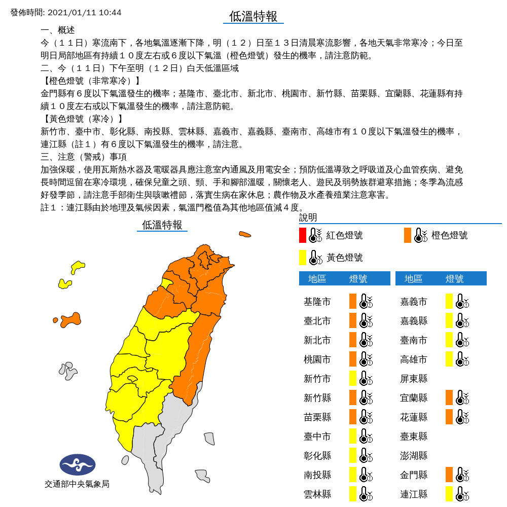低溫特報發佈時間:2021/01/11 10:44