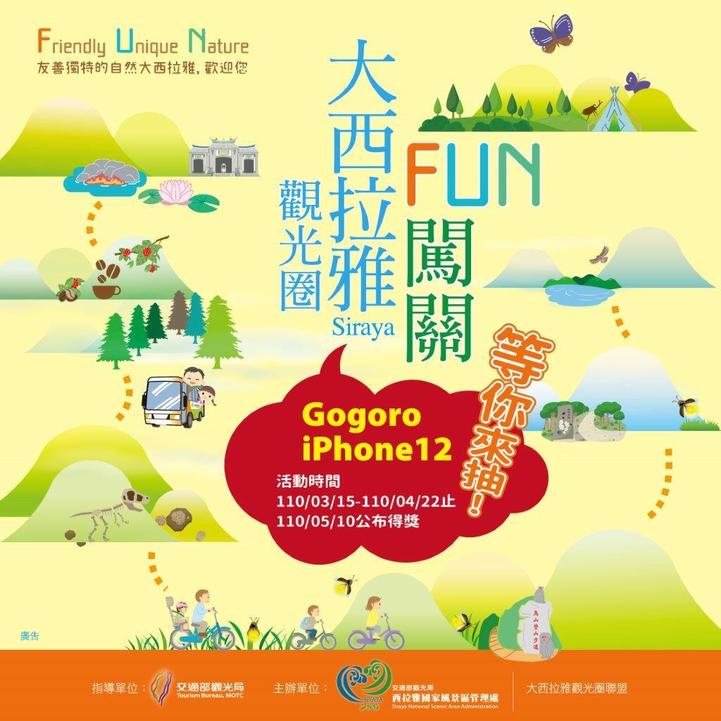 「大西拉雅觀光圈FUN闖關」活動開跑囉!從3月15日起至4月22日止,西拉雅管理處與大西拉雅觀光圈聯盟內43家業者共同合作,讓遊客能於活動期間享受購物及闖關集章樂趣,只要參與活動就有機會抽中Gogoro電動車及iPhone 12等大獎。在活動期間於大西拉雅觀光圈指定業者及遊客中心便可領取闖關卡,只要於活動指定店家消費滿100元以上便可蓋一個印章,集齊兩個印章後,將闖關卡交給店家並保留存根聯,即可擁有抽獎資格,期許藉由抽獎活動吸引遊客前往大西拉雅觀光圈遊玩,並為即將到來的清明連續假期,讓各地民眾能夠至觀光圈消費,並配合闖關活動玩得盡興。活動奬項將於5月10日於西拉雅管理處的官方FB紛絲專頁公佈得獎名單。