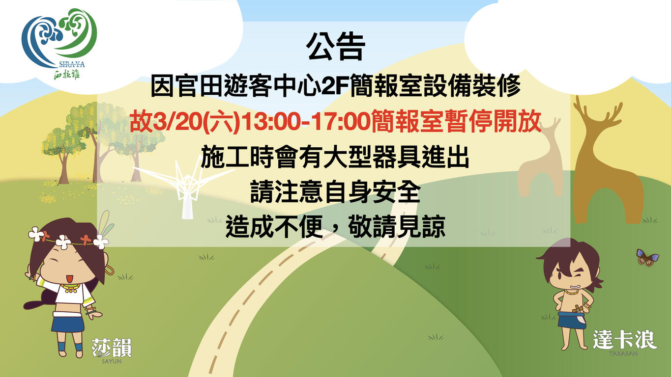3/20(六)13:00-17:00官田遊客中心2F簡報室暫停開放