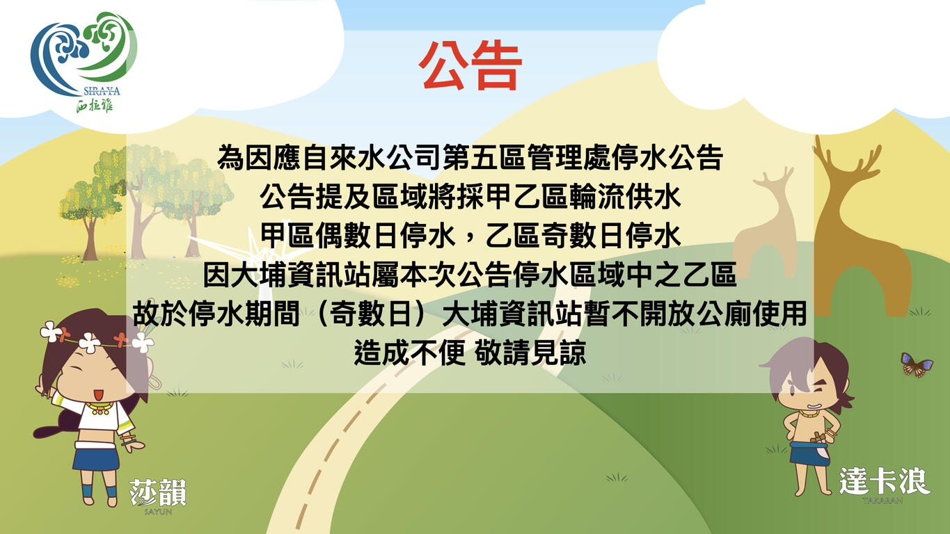 因應嘉義縣大埔鄉停一供一供水措施 大埔資訊站於停水期間(奇數日)暫不開放公廁使用