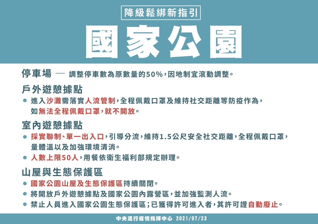 因應中央流行疫情指揮中心維持疫情警戒標準為第二級,本處轄下遊客中心及各據點因應二級警戒相關開放措施如下: