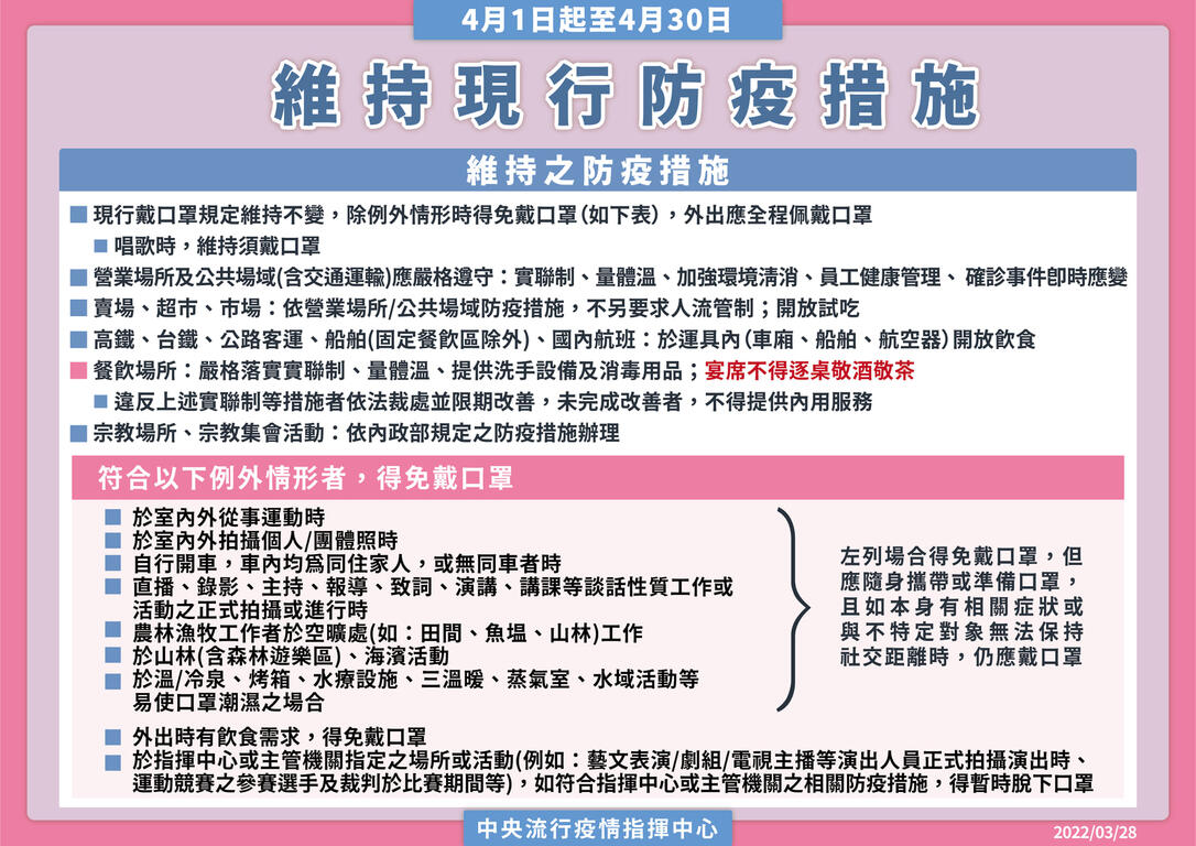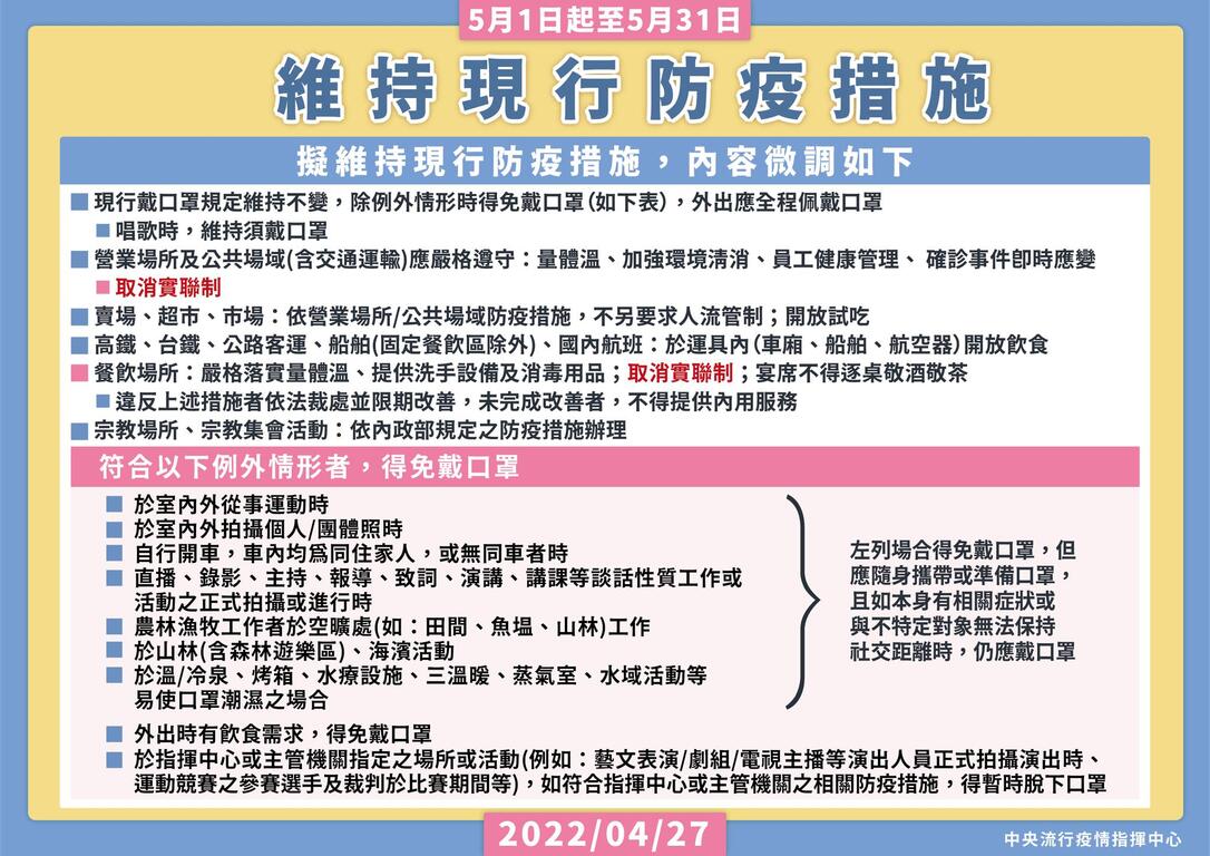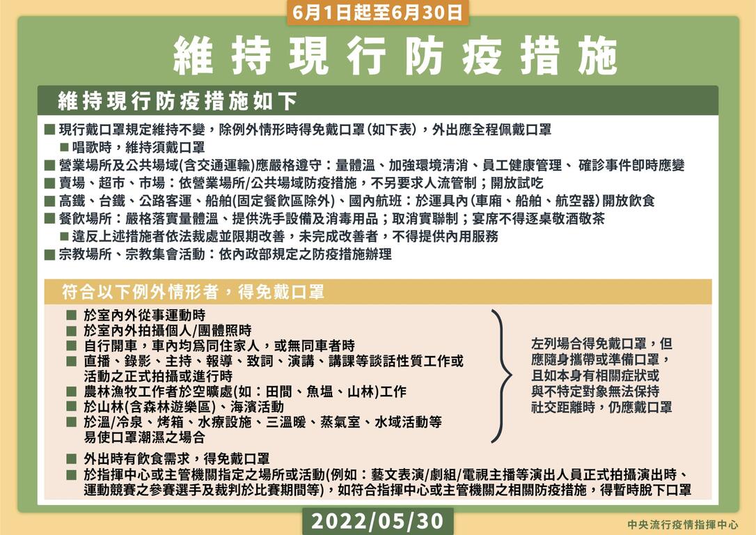 中央流行疫情指揮中心今(28)日宣布,考量國內疫情趨緩、呼吸道傳染病流行情形平穩,為兼顧防疫、經濟及社會運作,維持國內防疫量能與有效控管風險,經綜合評估疫情情勢,12月1日起適度放寬戴口罩等防疫措施,相關規定說明如下: