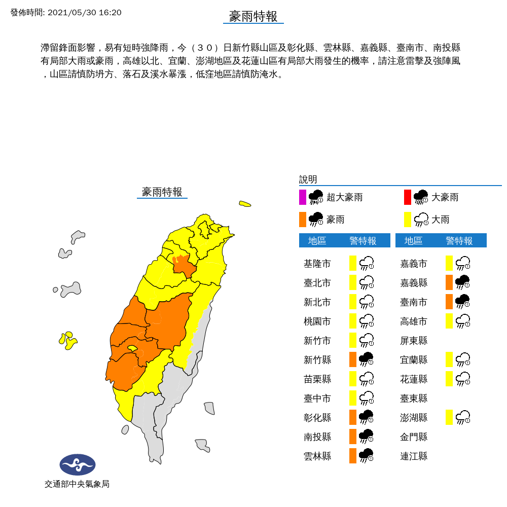 滯留鋒面影響,易有短時強降雨,今(30)日新竹縣山區及彰化縣、雲林縣、嘉義縣、臺南市、南投縣有局部大雨或豪雨,高雄以北、宜蘭、澎湖地區及花蓮山區有局部大雨發生的機率,請注意雷擊及強陣風,山區請慎防坍方、落石及溪水暴漲,低窪地區請慎防淹水。