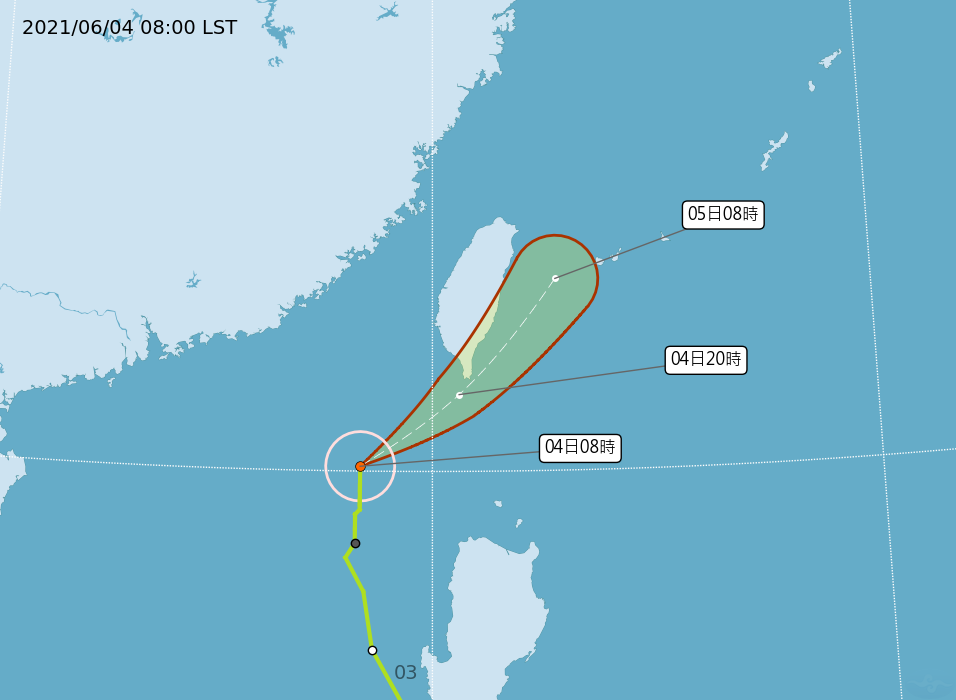 4日9時的中心位置在北緯 20.2 度,東經 118.5 度,即在鵝鑾鼻的西南方約 320 公里之海面上