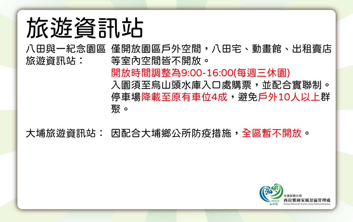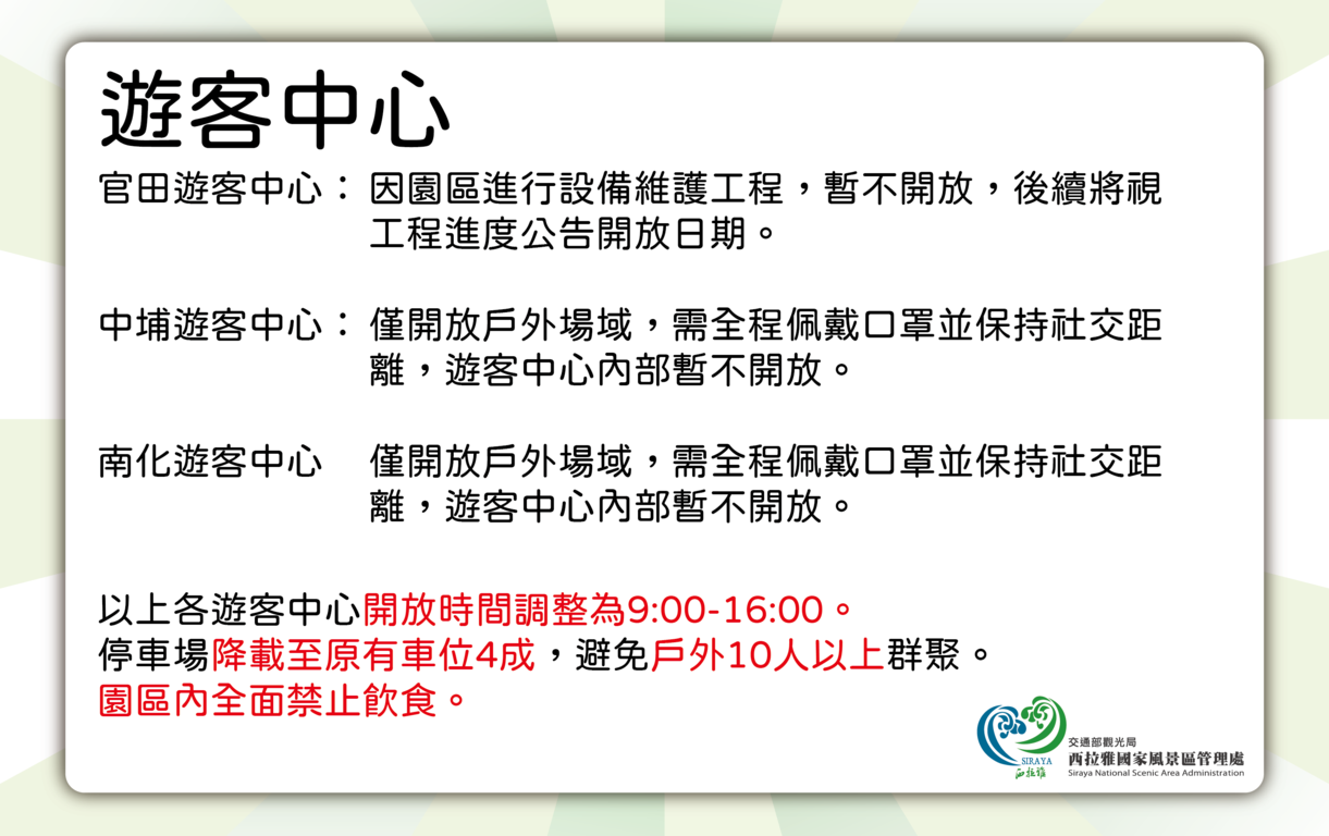 本處轄下各遊客中心、旅遊資訊站、出租據點及開放型景點之開放情形將調整如下。