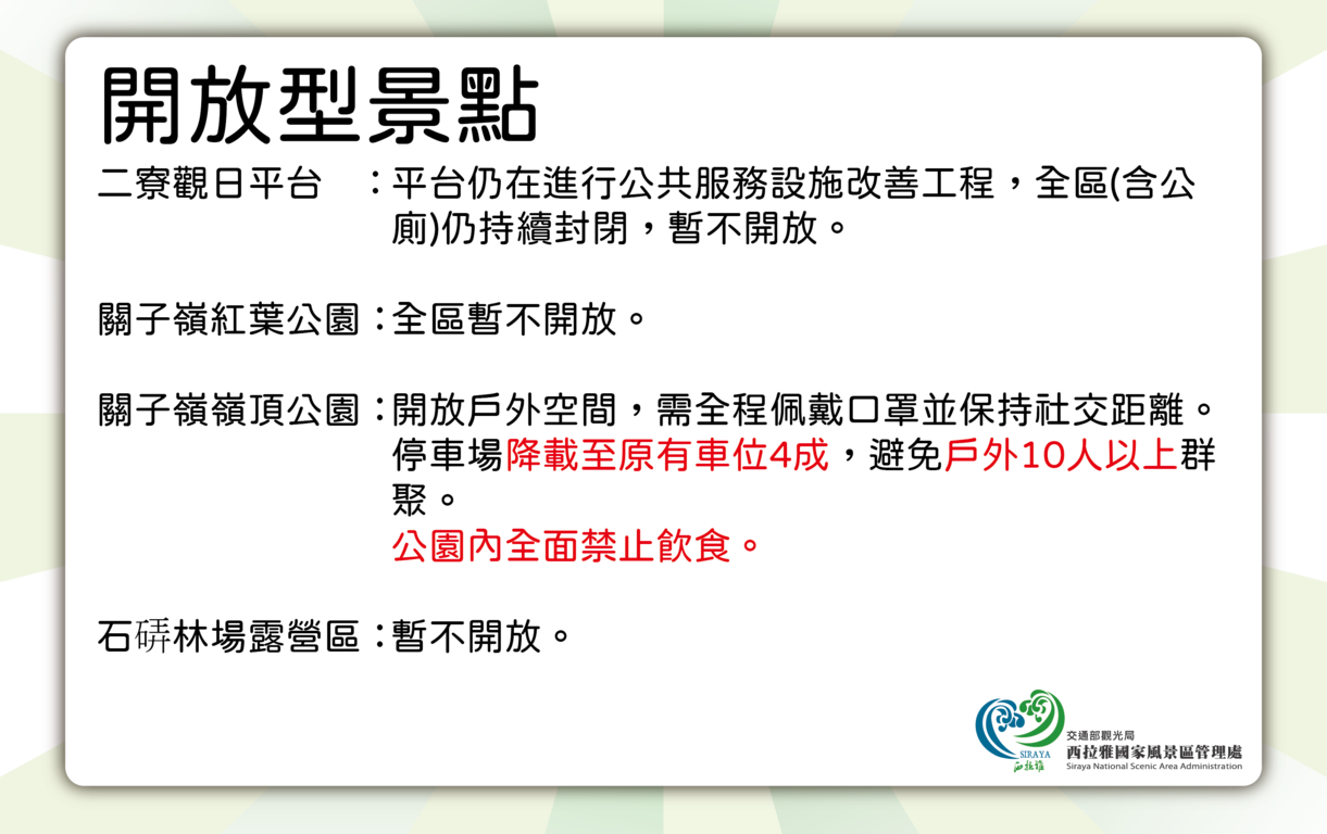 - 關子嶺嶺頂公園:開放戶外空間,需全程佩戴口罩並保持社交距離,停車場降載至原有車位4成,避免戶外10人以上群聚。 公園內全面禁止飲食。