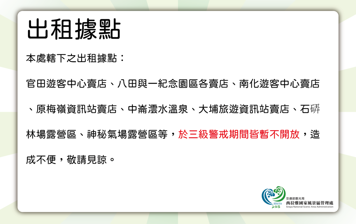 本處轄下之出租據點: 官田遊客中心賣店、八田與一紀念園區各賣店、南化遊客中心賣店、原梅嶺資訊站賣店、中崙澐水溫泉、大埔旅遊資訊站賣店、石硦林場露營區、神秘氣場露營區等,於三級警戒期間皆暫不開放,造成不便,敬請見諒。