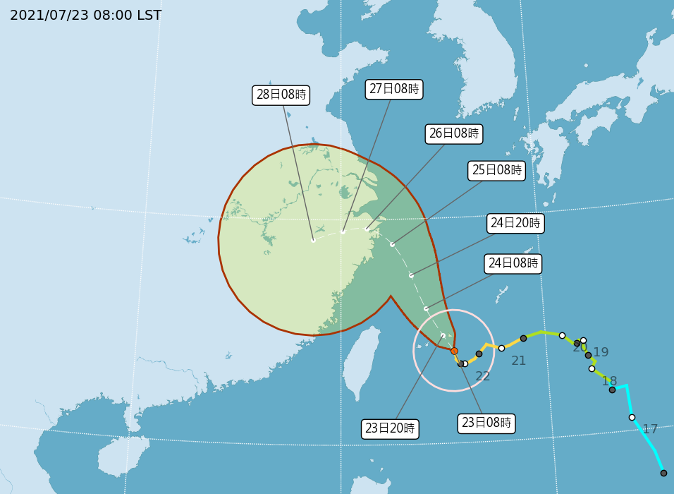 - 中心位置:23日8時的中心位置在北緯 24.1 度,東經 125.5 度,即在臺北的東南東方約 420 公里之海面上