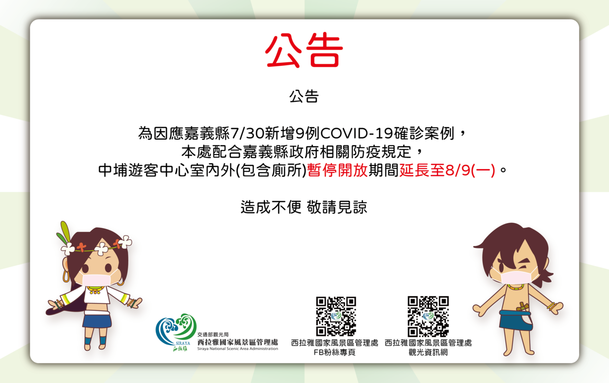 中埔遊客中心即日起至8/9暫停開放公告(8/6更新)