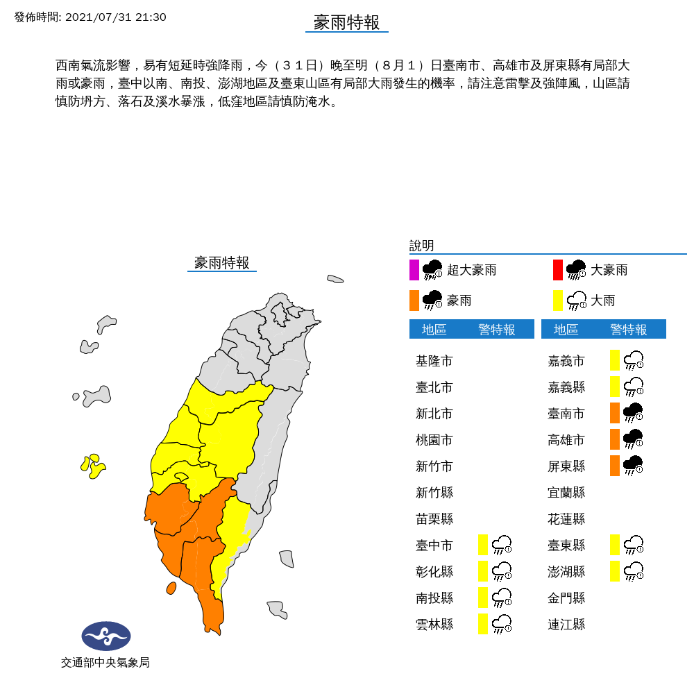 110年0731西南氣流豪雨事件發布時間:07/31 21:30西南氣流影響,易有短延時強降雨,今(31日)晚至明(8月1)日臺南市、高雄市及屏東縣有局部大雨或豪雨,臺中以南、南投、澎湖地區及臺東山區有局部大雨發生的機率,請注意雷擊及強陣風,山區請慎防坍方、落石及溪水暴漲,低窪地區請慎防淹水。詳細天氣資訊請上中央氣象局官網查詢。