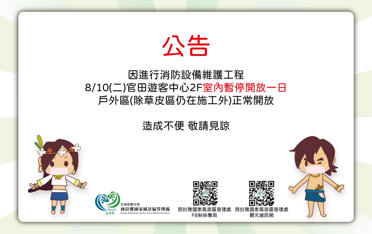 8/10(二)官田遊客中心2F室內暫停開放一日