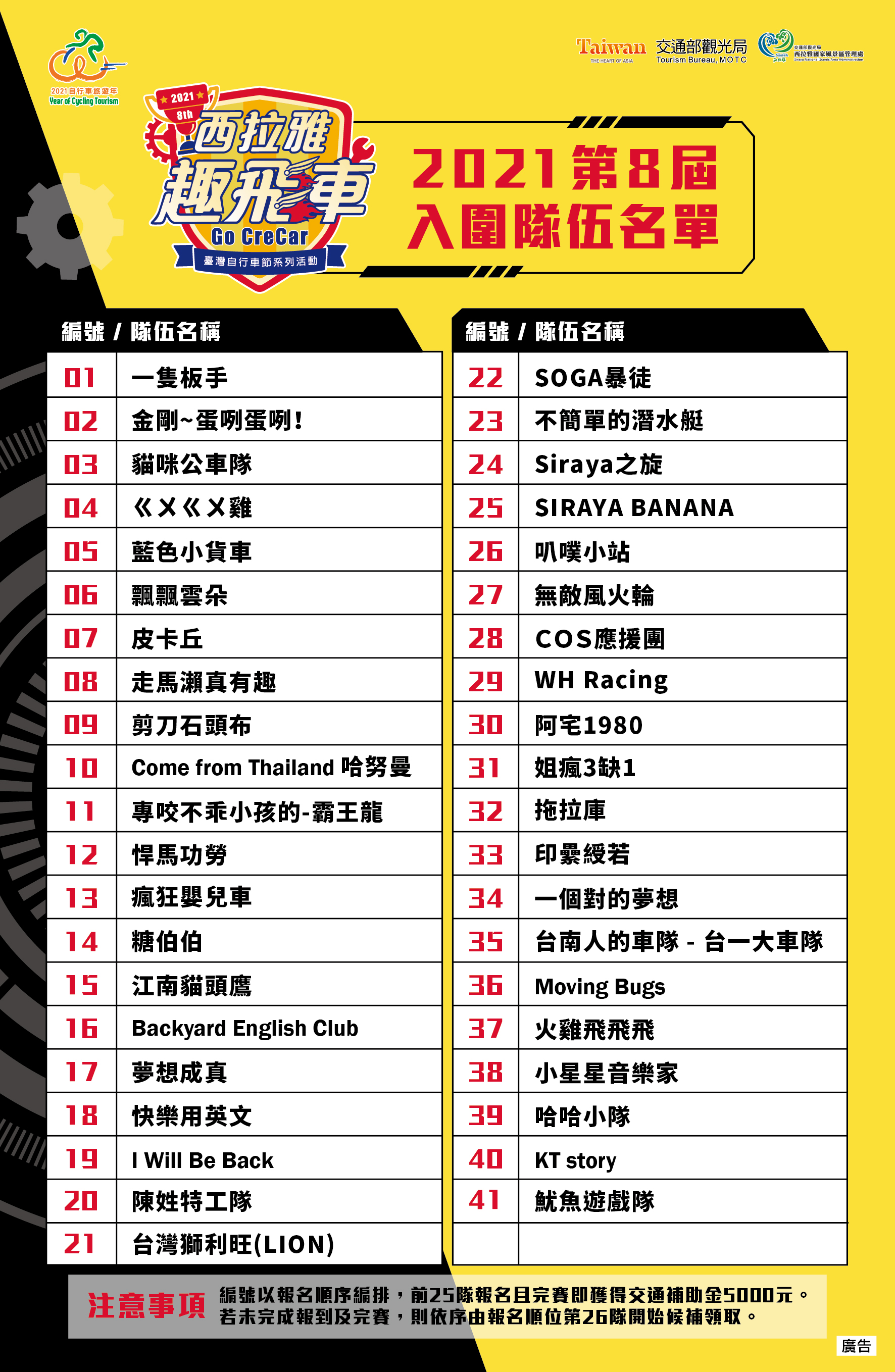2021 第八屆西拉雅趣飛車 入圍隊伍名單