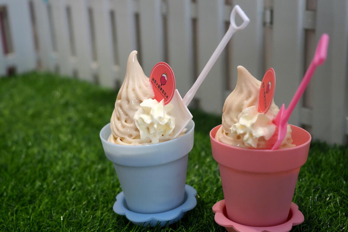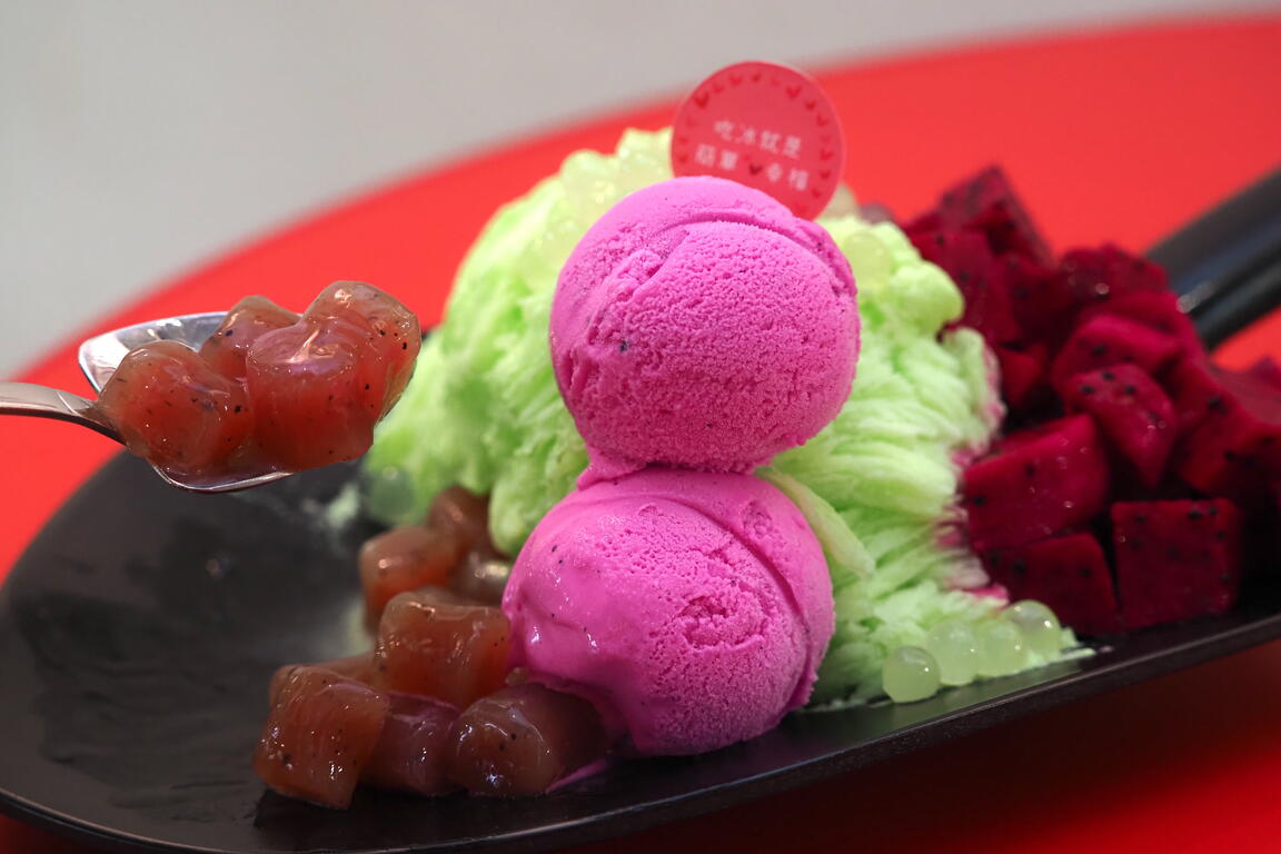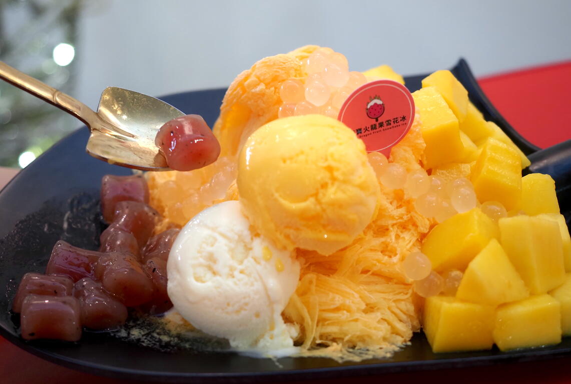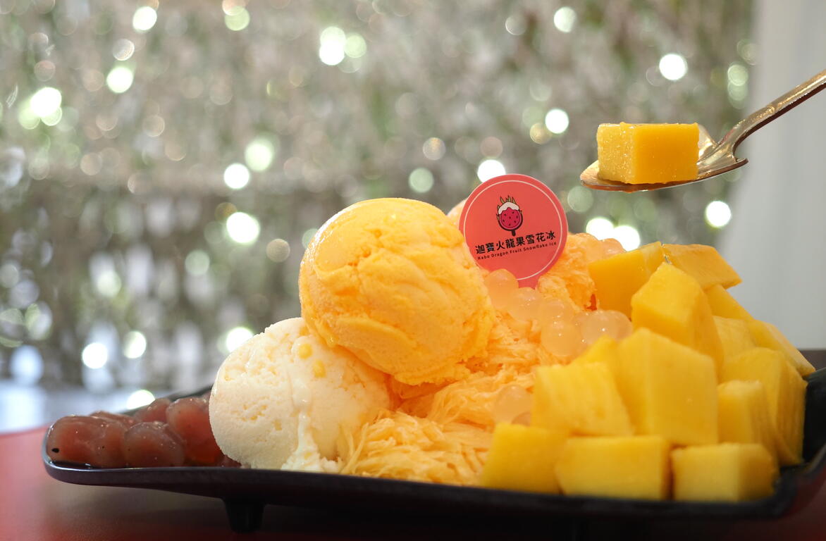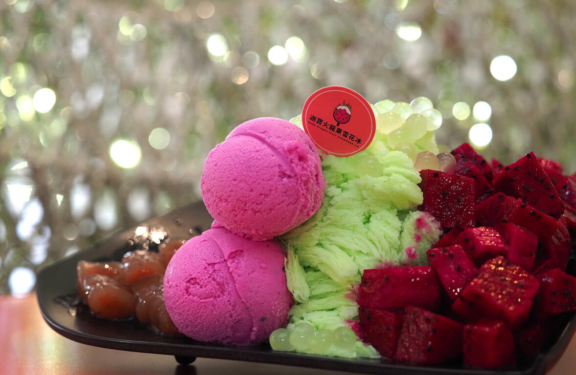 店內招牌「火龍果雙享綜合雪花冰」以鏟子造型器皿盛裝,創意十足,冰品由哈密瓜雪花冰作為基底,佐上火龍果冰淇淋、新鮮火龍果、火龍果Q圓、荔枝啵啵球 4 種配料。