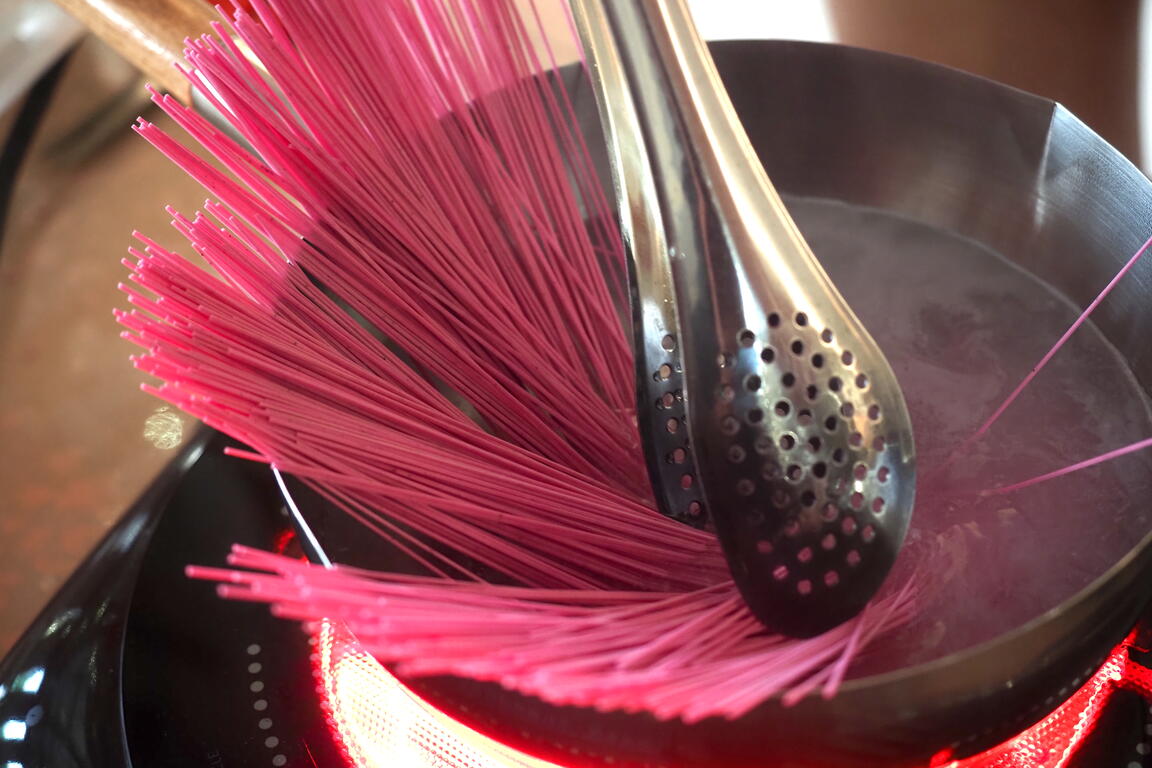 迦寶的另一項特色商品即是粉色的火龍果麵線,店家特製香氣濃郁的「老薑麻油」口味及勁辣的「香辣椒麻」兩種口味,不僅可以在店內享用,還能選購袋裝拌麵,送禮自用兩相宜。