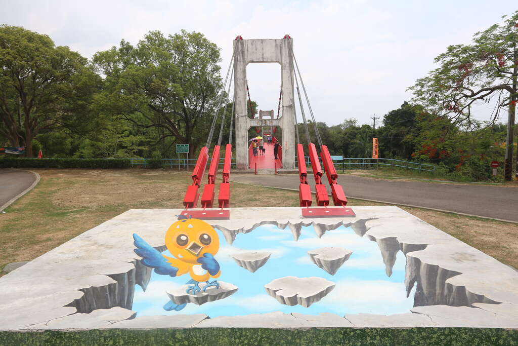 在吊橋前端有3D彩繪圖案,站在彩繪圖上拍照,感覺就像站在漂浮的岩石上,來水庫玩記得來打卡喔!