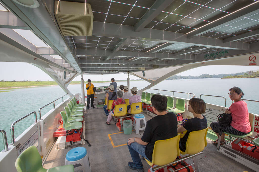 烏山頭水庫不僅能在陸地上遊玩,也能搭乘遊艇遊水庫,坐在太陽能艇上隨著船離岸駛向水庫中央,觀賞水庫的湖光山色,帶著水氣的風拍打在臉上,聽著解說員介紹水庫設施與八田先生建造水庫時的趣聞,你將會更加瞭解水庫的故事。